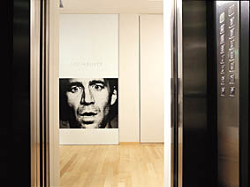 Tenslotte is er een verticale beweging, een gelaagdheid opgebouwd rond het gezicht, het uiterlijke. Hiervoor gebruikte de kunstenaar een reeks opnamen van een man die diverse gezichtsuitdrukkingen weergeven, hij gaf die een plaats in de ruimte waar de liften zich situeren. De foto's schuiven als het ware per verdieping mee terwijl ook hier een woord steeds op dezelfde hoogte blijft.